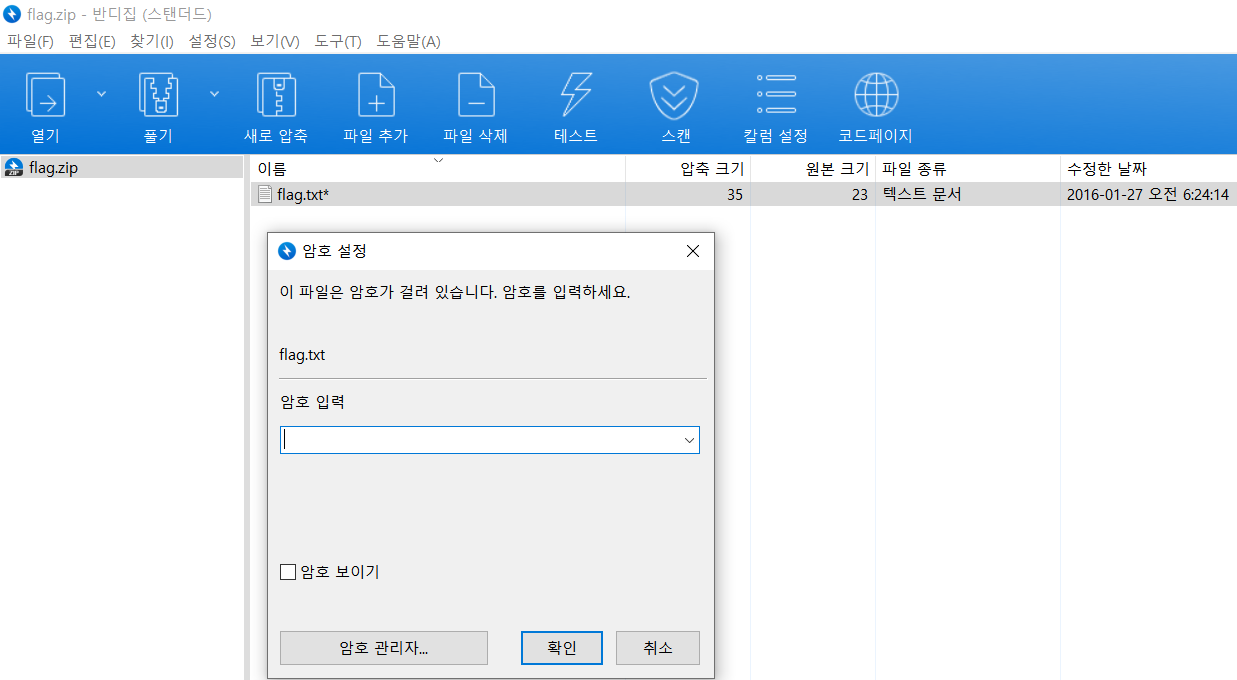 해당 부분만 가져와 flag.zip 파일로 저장하면 flag.txt가 존재하는 것을 알 수 있고 flag.txt에 Flag가 있을 것이라고 생각하였으나 암호가 걸려 있었다..