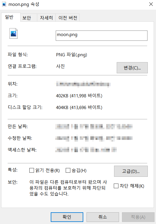 moon.png 파일의 속성을 보면 비정상적인 데이터는 발견할 수 없다.