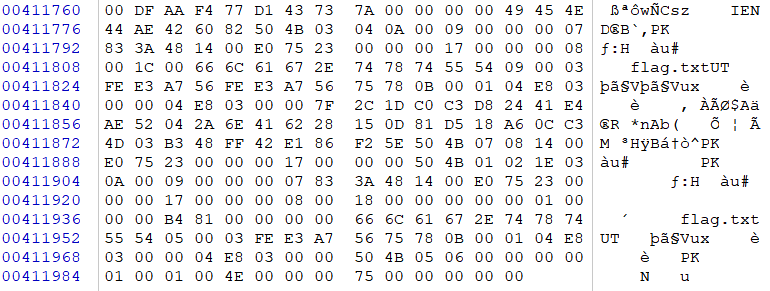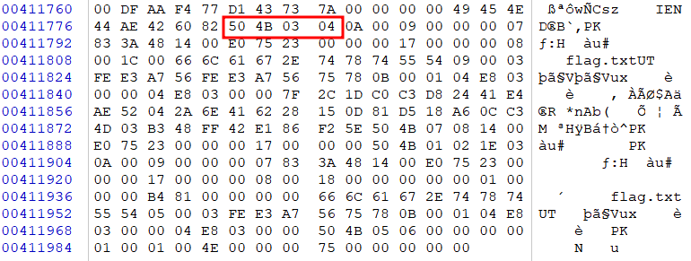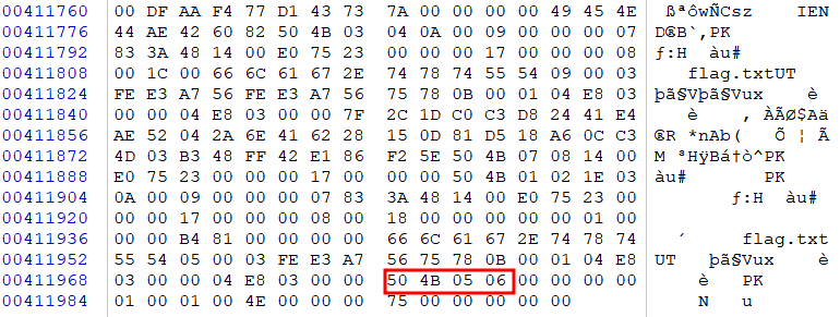 푸터 시그니처부분을 자세히 보면 flag.txt 라는 문자열이 존재하고 ZIP 파일의 시그니처도 확인할 수 있다. ZIP 파일의 헤더 및 푸터 시그니처는 다음과 같다.