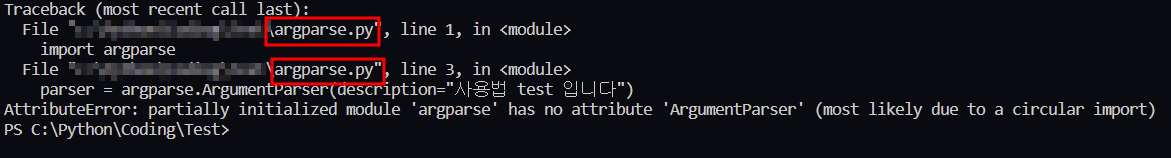 ์ค์ ์์ ์๋ฌ ์ฌ์ง๊ณผ ๊ฐ์ด argparse.py๋ก ํ์ผ์ ์์ฑํ์๊ธฐ ๋๋ฌธ์ ํด๋น ์๋ฌ๊ฐ ๋ฐ์ํ์๋ค.