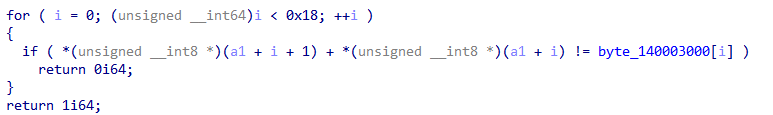 compare_fun() 함수는 i 번째 입력 값(a1)과 i+1 번째 입력 값(a1+1) 을 더한 값이 byte_140003000[i] 값과 일치해야 한다.