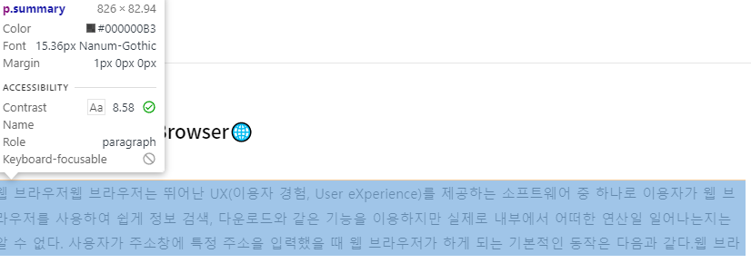 요소 검사 시 다음과 같은 특정 요소에 대한 개괄적인 정보를 확인할 수 있으며 그에 해당하는 코드 또한 쉽게 찾을 수 있다.