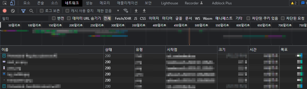 현재 페이지를 구성하는 웹 리소스들을 확인할 수 있다.