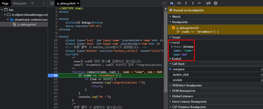 Sources 에서는 BP설정 및 디버깅이 가능하기 때문에 다음과 같이 if (name == 'dreamhack') 구문에 BP를 걸고 값을 입력할 시 할당된 변수의 값을 확인할 수 있다.