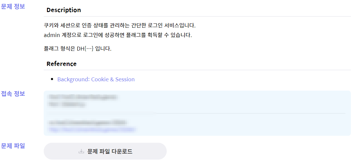 해당 문제로 접속할 경우 접속할 URL 정보와 문제 파일이 존재한다. 또한, 주어진 URL로 접속하면 다음과 같이 간단하게 Session, Home, login 등과 같은 기본적인 기능만 존재한다.
